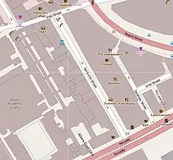The land on which Sackville Street stands, like Albany and Burlington House, was formerly known as Stone Conduit Close. It was bounded on one side by Penniless Bank and on the other by Swallow Close. It passed into Crown ownership in 1536 and formerly belonged to the Abbot and Convent of Abingdon. The land was then much divided, leases granted and ended, and ownership changed several times.[1] Sackville Street is first mentioned in the Ratebooks in 1679.[2]