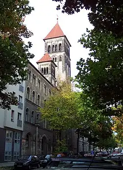 The Sacred Heart Church (German: Herz-Jesu-Kirche) is a Catholic church located in Berlin-Prenzlauer Berg, externally built in Neo-Romanesque style. Designed by Christoph Hehl, professor of medieval architecture, the building was completed after 16 months of constructions in 1898. The Neo-Byzantine-style murals inside the church were done by Friedrich Stummel.[1][2]