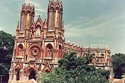 In 1866, a thatched shed was constructed, which functioned as St. James church for Idaikattur parish. Fr. Ferdinandus Celle, SJ, the parish priest travelled to France in 1886 to gather funds for the construction of a church building. An Anglican woman named Mary Anne who was suffering from an acute heart ailment received a miraculous cure after praying a Catholic novena to the Sacred Heart of Jesus.[2] Mary Anne donated 2000 francs to Fr. Celle for the construction, with the request that the new church would be dedicated to the Sacred Heart Church and that it would be a replica of the Rheims Cathedral.[1]