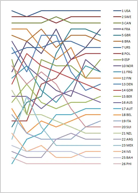 Graph showing the daily standings in the Soling during the 1972 Summer Olympics