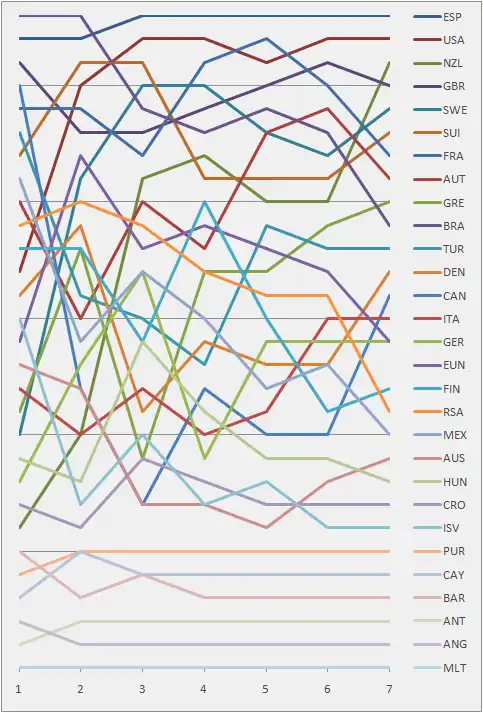 Graph showing the daily standings in the Finn during the 1992 Summer Olympics