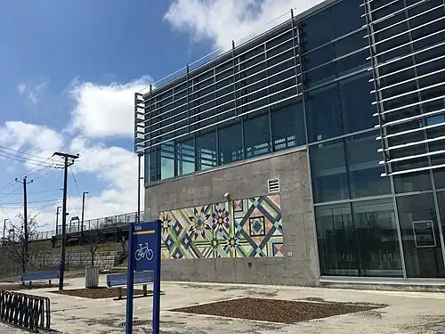 A ceramic mural by Shelley Miller entitled Tissu urbain is located on the exterior wall of the headhouse, with smaller components inside.[5]