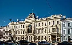 In 1864, the State Bank gave them a small place in its building. Later, in 1871, the society found a larger place in a private apartment in Lesnikov's house located on 18/27 Ekaterininsky canal.[5] But it had soon turned out that the places they occupied were not enough for keeping financial papers and assets. In 1887 the board suggested that the General Assembly give them a loan of 500,000 Rubles to construct a building for the Society.[5] The construction was charged with Count Paul-Jules de Suzor. The Assembly commissioned a board member Mikhail Nikitich Kobyzev (Michel Kobyseff) and Count Suzor to Europe in order to study the organization of bank and credit. Upon their return, Suzor's project was approved and the construction was supervised by Kobyzev. In 1890 the society moved into the new building.[5]