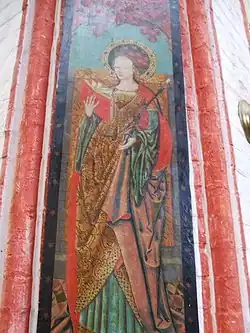 There are 52 known images of her in various English churches that survived the ravages of the 16th-century Commissioners. These are concentrated in Devon and East Anglia. Most of these images are on the panels of rood screens or featured in stained glass with only one being a stone capital (Stokeinteignhead, Devon). She is also depicted in a tapestry of circa 1499 at St. Mary's Guildhall, Coventry.