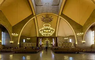 The huge cathedral is a complex consisting of three churches: the Cathedral (Main Church) with 1700 seats and the Chapels of Saint Tiridates the King and of Saint Ashkhen the Queen (both with 150 seats). These two royal figures were the crucial helpers of St. Gregory in converting Armenia to Christianity. The belfry tower (which consists of more than 30 arches) and the court are located at the entrance of the Cathedral. Halls for receptions and church-related activities are provided on the lower floor of the Main Church.