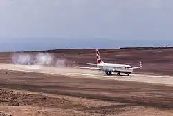 The first large (above 100 seats) passenger jet landed on 18 April 2016, a Boeing 737-800 operated by Comair. It was an implementation flight without passengers, to test the route, ground operations and handling, ahead of commencement of scheduled services.[50] The landing had complications: the first approach was a planned go-around to familiarize the pilots with the airport, the second was aborted close to the ground by the pilots due to wind shear, and on the third (successful) approach it also experienced wind shear.[51][52][53] On 26 April, the St. Helena Government announced an indefinite delay in opening the airport, because of safety concerns about wind shear.[12] The economic impact included extending the use of the RMS St Helena, which was due to be retired after the airport opened.[54][55][56]