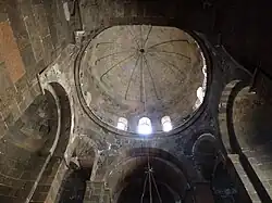 Its dome is regarded as the pinnacle of perfection in Armenian architecture.[203] Its cupola, which places a windowed drum on a circular cornice, is seen as the church's most significant feature in the development of Armenian architecture.[112] The dome rests on a slightly rectangular bay of 10.10 m × 9.52 m (33.1 ft × 31.2 ft),[188][18] topped by a conical roof[204] on a low, sixteen-faceted drum with twelve windows.[4][70] It is unusually large for the size of the church.[68] The conical apex contains an interior hollow that keeps the center of gravity low to resist earthquake damage.[178] The four corner sections contain small tower-like structures (turrets) placed at the cubical base.[205][112] Thomas F. Mathews describes them as "an unicum in Armenian architecture."[112] They are hollow and provide access from the cornice walk-way to crawl space above the squinch vaults.[112] They function as stabilizing counterweights for the drum,[112][206] and restrain lateral thrust, serving as both anchors and buttresses.[178]