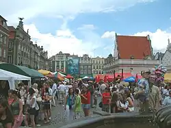 The tradition was revived in 1975 on the initiative of President Andrzej Wituski (inspired by the appearance of Grand-Place in Brussels) and temporarily connected with the organization of the Poznań International Fair.[3] At that time, state trade prevailed and one could buy scarce goods, which were absent from the shelves of shops on ordinary days. Nowadays, the fair is an arena for trade in handicrafts, regional food and antiques. It is accompanied by numerous festivals and cultural performances, mainly musical. It is one of the magnets that attracts tourists.[4]