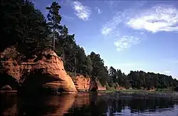 The Salaca (Estonian: Salatsi jõgi) is a river in northern Latvia.[1] It flows from Lake Burtnieks in Vidzeme, 90 km, to the Gulf of Riga. The river flows through three towns, Mazsalaca, Staicele and Salacgrīva. The riverbanks feature Devonian red sandstone cliffs, and many caves and rapids as well. The river gives its name to a dialect of Livonian (Salaca Livonian[2]) spoken on its upper banks into the 19th century, which is today extinct.