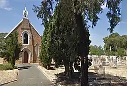 The first St John's Anglican Church was established on the block in Church Street about 1846 or 1850, one of the first churches to be constructed in Salisbury. As the size of the congregation increased, a second church, designed by Daniel Garlick in Gothic style, was built in 1865, after the first foundation stone was laid by Bishop Augustus Short in 1858. The smaller old church was used as a school from 1851 to 1877 in addition to serving as a church until 1865. The replacement church was gutted by fire in 1989, after being heritage-listed on the Register of the National Estate for its fine stained glass windows and other significant architectural and historical features. In 1995 an auditorium was built connecting the church and the church hall.[24] The inaugural Edmund Wright Heritage Award for Heritage Places in 2003 was won by Peter Moeck for the new auditorium project by Brown Falconer.[25] As of 2024 the official name of the church is Church of Saint John The Evangelist,[26] but it is known as St John's Anglican Church.[27]