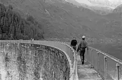 Left: Salmon Creek Dam in 2006 after rehabilitation; top of the dam 6.5 ft (2.0 m) walkway. Right: Salmon Creek Dam, full arch downstream view.