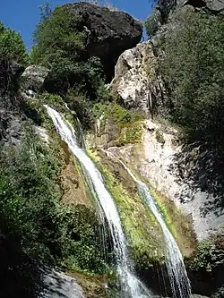 Salmon Creek Falls is a 120-foot (36 meter) waterfall in the southern Big Sur region of Monterey County, California. The falls are located along California State Route 1 about 2.9 mi (4.7 km) northwest of Ragged Point and lies within the Monterey Ranger District of the Los Padres National Forest and Silver Peak Wilderness.