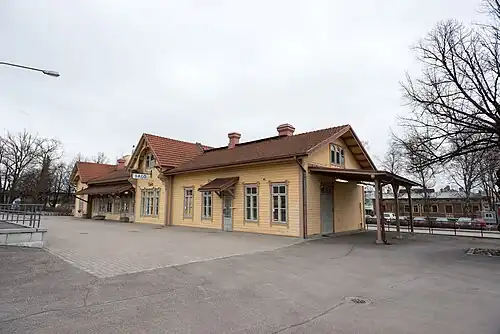 Salo railway station (Finnish: Salon rautatieasema, Swedish: Salo järnvägsstation) is located in the town of Salo in the Southwest Finland region, Finland. All passenger trains between Helsinki and Turku stop at Salo, and the station also serves cargo traffic. About 320 thousand passengers use the station every year. Inside the station, there is one automatic ticket vending machine. The station has three elevated platforms for passenger traffic, and for going underneath the tracks, there is a tunnel, with exits by stairs and elevator.