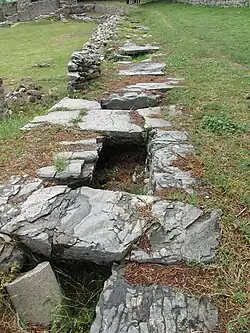 The city quickly acquired Roman characteristics: walls, a forum, a theatre, an amphitheatre which are the most conspicuous above-ground remains today, public baths, and an aqueduct.[8] Many inscriptions in both Latin and Greek have been found both inside the walls and in the cemeteries outside, since Romans forbade burials inside the city boundaries. Several fine marbles sarcophagi from those cemeteries are now in the Archaeological Museum of Split. All this archaeological evidence attests to the city's prosperity and integration into the Roman Empire. Salona had a mint that was connected with the mint in Sirmium and gold and silver mines in the Dinaric Alps through Via Argentaria.[9][10][11][12]