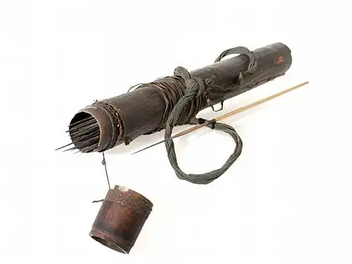 The Salukat is a quiver made of a long segment of bamboo with a partition at the lower part and a long sharp protrusion at the tip.[1] The arrow used are not fletched. In some cases the nock was provided by whipping two slivers of wood on opposite sides of the tail end of the shaft in such a way that they projected a short distance beyond it. The Mentawai people generally put poison on the tips of their arrows, using a mixture of omai (Antiaris toxicaria), lombok (Capsicum annisum), tuba (Derris elliptica) and baglai (Alpinia galanga). The arrow is known as logui and the anterior section of the foreshaft alone as bakulu.[2]