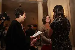 On the day of the Strauss v. Horton decision on May 26, 2009–in which the Supreme Court of California upheld Proposition 8 as a lawful amendment of the State Constitution–the American Foundation for Equal Rights (AFER) filed suit in the U.S. District Court for the Northern District of California to challenge the validity of Proposition 8 under the U.S. Constitution in a case known as Perry v. Schwarzenegger. Judge Vaughn Walker ordered a full trial which began in January 2010. It addressed questions as wide-ranging as whether being gay diminishes one's contribution to society, affects one's ability to raise children, impairs judgment, or constitutes a mental disorder.[85] Judge Walker ruled that Proposition 8 was unconstitutional, violating both the Due Process and Equal Protection clauses of the U.S. Constitution, and on August 12, 2010, had scheduled to deny a motion to stay the ruling throughout the appeals process. On August 16, 2010, the Ninth Circuit Court of Appeals granted the motion to stay, ordered expedited briefing on the merits of the appeal, and directed the parties to brief the issue of why the appeal should not be dismissed for lack of standing.[86] On August 17, the same Ninth Circuit panel ordered expedited briefing on the Imperial County appeal.[87] The court also ordered both appeals calendared for oral arguments during the week of December 6, 2010 in San Francisco. On February 7, 2012, in a 2–1 decision, a three judge panel of the Ninth Circuit affirmed the trial court's decision in Perry v. Brown, which it stayed pending appeal. Proponents of Proposition 8 appealed to the U.S. Supreme Court on July 31, 2012, and the court granted certiorari on December 7, 2012 as Hollingsworth v. Perry. On June 26, 2013, the U.S. Supreme Court found that the Proposition 8 supporters did not have standing for their appeal, and thus ordered the Ninth Circuit to void their ruling, leaving Walker's decision standing.[88] The Ninth Circuit lifted its stay on June 28, allowing same-sex marriages to proceed in California once again. Kristin Perry and Sandra Stier, two of the plaintiffs in Perry, were married shortly afterward at San Francisco City Hall, making them the first same-sex couple to be married in California since Proposition 8 was overturned. The officiant was the Attorney General of California, Kamala Harris.[89]