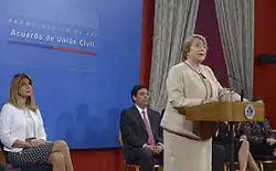 Even though some minor presidential candidates had announced their support for same-sex marriage, Michelle Bachelet was the first major candidate to declare her support in the lead up to the November 2013 presidential elections. On 11 April 2013, she announced her intention to legalize same-sex marriage if elected president. Bachelet, who had previously been president of Chile between 2006 and 2010, won the election on 15 December 2013.[62] After Bachelet's inauguration in March 2014, MOVILH announced that they would seek an amicable solution to the lawsuit presented to the Inter-American Court of Human Rights in 2012. On 10 December 2014, a group of senators from various parties presented a bill legalizing same-sex marriage and adoption to the National Congress of Chile, with the support of MOVILH.[63] On 17 February 2015, lawyers representing the government and MOVILH met to discuss the case, and the government announced that they would drop their opposition to same-sex marriage.[64] A formal agreement between the two parties and the Inter-American Commission of Human Rights was signed in April 2015.[64]