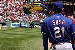 The Texas Rangers, Sosa's original team, signed him to a minor league deal worth $500,000 on January 30, 2007.[23] This was the same contract that Sosa turned down the previous year from the Nationals. The contract included an invitation to spring training, where Sosa competed for a spot in the lineup with Nelson Cruz, Jason Botts, and other rookies/prospects.[24] Sosa was successful during spring training and was added to the team's 25-man roster. He started the 2007 season as the Rangers' designated hitter and occasional right fielder. At the same time, the Chicago Cubs awarded Sosa's number 21 to new pitcher Jason Marquis, who coincidentally served up Sosa's 600th career home run. This caused some concern, due to Sosa's accomplishments with the Cubs, including his status as the Cubs' all-time home run leader.[25]