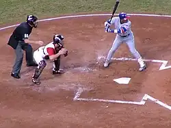 In 2003, the Cubs won the National League Central Division title. In May, he spent his first period on the disabled list since 1996 after having an injured toenail removed. On June 3, 2003, Sosa was ejected from a Chicago Cubs-Tampa Bay Devil Rays game in the first inning when umpires discovered he had been using a corked bat.[13] Major League Baseball confiscated and tested 76 of Sosa's other bats after his ejection; all were found to be clean, with no cork. Five bats he had sent to the Hall of Fame in past years were also tested, and were all clean as well.[14] Sosa stated that he had accidentally used the corked bat, which he claimed he only used during batting practice, and apologized for the incident.[15] When Cubs manager Dusty Baker was interviewed later, he stated any use of corked bats on his team is strictly prohibited. On June 6, Sosa was suspended for eight games all without pay[16] which was reduced to seven games (again without pay) on June 11 after appeal.[17] Sosa finished the season with 40 home runs and hit two more in the 2003 NLCS against the Florida Marlins, falling to the team in seven games.