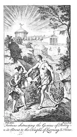 In 1757, he published Poems on Several Occasions, which included an ode entitled Glory, addressed to the Duke of Cumberland, and a heroic poem in two cantos, dedicated to actor David Garrick, called Paris, or the Force of Beauty. The frontispiece, engraved by Boyce himself, was an allegorical scene depicting "Fortune obstructing the Genius of Poetry in its ascent to the Temples of Learning and Fame".[2]