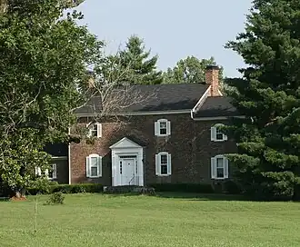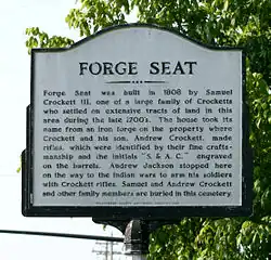 Andrew Crocket, Samuel's father, received a 640-acre (260 ha) grant for Revolutionary War services. He built his first log home on the southeast side of what is now Brentwood in 1799. His son, Samuel Crockett built a two-story brick home nearby, which was completed ca. 1808. The home became known as "Forge Seat" because of the iron forge located on the property. Samuel Crockett and his son, Andrew, made iron implements here and specialized in rifle making.[2] Crockett's rifles "were identified by their fine craftsmanship and the initials 'S. & A. C.' engraved on the barrels."[3] On his way to New Orleans and the War of 1812, Andrew Jackson stopped here and purchased rifles to arm his soldiers. It is also said that Davy Crockett stopped on his way to Texas as well.[4]