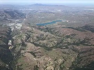 San Antonio Reservoir is located in Alameda County, California, about three miles east-southeast of Sunol. It was built in 1964[1] by the City and County of San Francisco. Formed by the James H. Turner Dam[2] across San Antonio Creek[1] not far above where it flows into Alameda Creek, its purpose is to store water from the Hetch Hetchy Aqueduct and local wells and watersheds. It has a capacity of 50,500 acre-feet (62,300,000 m3).[1]