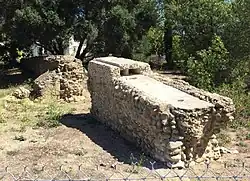 Few vestiges of it remain today. Large sections were destroyed in a Great Flood of 1862,[2] and settlers used stones from the old aqueduct to build homes.[6] The combined effects of floods, land cultivation, neglect and land development reduced most of the aqueduct to rubble.[3] The only significant section that remains is located at the mouth of Canyada canyon on land that was formerly known as Rancho Cañada Larga o Verde owned by the Canet family from 1873 until at least the 1960s.[4][7] This remaining section is 100 feet long and ten feet high, and is believed to have "served as a siphon, drawing water uphill through conduits."[6] The location is at 234 Canada Larga Road near the road's interchange with the Ojai Freeway.[5]