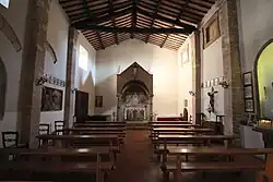 The interior houses a main altar, roofed by an elaborate ciborium, with the posterior wall possessing a large, well-restored 15th-century fresco depicting an Enthroned Madonna, Saints, and Angels, painted by a follower of Boccati. Nearby, among other quattrocento frescoes, is a 15th-century fresco depicting the Enthroned Madonna with Sts Sebastian and Stephen.[1] The church also has two canvases depicting Miracles of St Anthony of Padua (Miracle of the Mule and Sermon to the Fishes) attributed to Giovanni Baglione.[2]