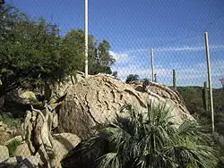 Opened in October 2004, Lion Camp houses the park's six African lions, Izu, Mina, Oshana and Etosha in a 1-acre (0.40 ha) exhibit.[28] The park's two other lions, Ernest and Miss Ellen, were moved to the San Diego Zoo. One side of the enclosure is dominated by an artificial rock kopje which has a 40-foot-long (12 m) glass viewing window and heated rocks.[28] The path continues along an acacia-studded ravine and leads to a replica observation tent. This has a smaller viewing window as well as a Land Rover for the lions to rest on.
