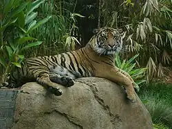 The Sumatran tigers, Denver and Rakan (male), Majel, Cathy, Debbie, and Diana, have three different exhibits, and there is a glass viewing window for visitors.[19][20] After raising $19.6 million for the new exhibit ground was broken on December 12, 2012. The new exhibit is named the Tull Family Tiger Trail after movie producer Thomas Tull and his wife.[21] Tiger Trail opened May 24, 2014. In August 2017, a Bengal tiger cub named Moka was rescued by border police from a car on the Mexican border and brought to the zoo.[22]