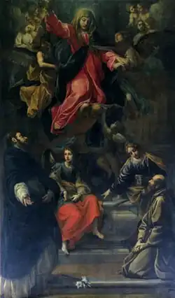 The church is notable for a portico with three arches added at the end of the 17th century with niches housing statues of St Dominic, Thomas Aquinas, Rosa of Lima, and Catherine of Alexandria. A central relief depicts the Assumption of the Virgin. The interior houses a main altarpiece depicting the Mysteries of the Rosary and the Assumption of the Virgin by Alessandro Tiarini. Other paintings include a St John the Baptist and St Peter Martyr by Francesco Albani; a St Vincent Ferrer (1765) by Ubaldo Gandolfi, a Miracle of St Domenic by Giuseppe Pedretti, and a St Rosa of Lima by Giovanni Battista Caccioli.[2]