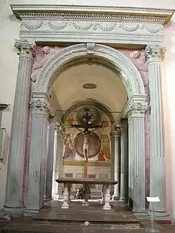 In the apse, the Cardini (or Orlandi-Cardini) chapel is entered through an elegant arch flanked by columns, all in pietra serena; it was designed by Andrea Cavalcanti, a pupil of Brunelleschi, and built in 1451-1458. That chapel houses a venerated 15th century stucco crucifix, called the Crocefisso della Corda Pia, which is said to have been involved in miracles. This chapel was found to have quattrocento-period frescoes, attributed to Neri di Bicci, depicting the brothers Cardini in prayer with the patrons of the town and valley.