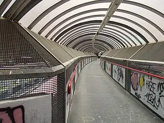 The station building is arranged on two levels: the upper floor, which is at street level, houses the entrance and ticket office, while the lower floor provides access to the tracks.[2]