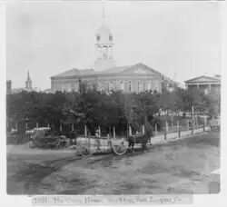 The land for what is now Courthouse Square was deeded to the City of Stockton by C.M. Weber in 1851, and the cost of a new courthouse was to be shared equally between city and county.[5]: 191–196  A tax of 14% was enacted to raise funds for the court house and city hall, which was designed by Ayres and Higgins in 1853. The cornerstone was laid on August 6, 1853, and the first courthouse was dedicated on April 17, 1854. Theodore Winters built it for a bid of US$83,920 (equivalent to $2,940,000 in 2024).[6]: 182  This first courthouse was approximately 60 ft × 80 ft (18 m × 24 m) and 50 ft (15 m) high.[7]: 68  After the Court of Sessions was abolished in 1862, the role of County Judge was held by several others.[4]: 83–84