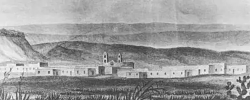 The San Miguel settlers had finished their church by 1811, and in 1812 the Pecos Pueblo priest moved to San Miguel.[9] San Miguel's population now outnumbered the declining Pecos Pueblo which was suffering from Hispanic encroachment of their land and Comanche raids. Following the Mexican War of Independence which ended in 1821, San Miguel del Bado became the administrative headquarters for the northeastern plains region of New Mexico with the election of an ayuntamiento or town council. In 1827 a detachment of Santa Fe presidio (the only formal presidio in New Mexico in the Mexican period) soldiers stationed at San Miguel classified as a separate company for protection against Indians and to reduce Santa Fe Trail smuggling and import tax evasion. In order to pacify hostile Plains Indians, soldiers were regularly provided with lances, firearm parts and trinkets for gifts. Bishop José Antonio Laureano de Zubiría, the first bishop to visit New Mexico in 72 years, visited the San Miguel church in 1833, describing it as "utterly deprived" and noted that "this parish church lacks even the most essential things for the celebration of the divine mysteries."[10] The customs house was moved from Santa Fe to San Miguel in 1835. This military protection encouraged permanent settlement of the Las Vegas grant. The expansion of the increasing population of San Miguel into areas further south along the Pecos River and into areas of northeastern New Mexico (such as Las Vegas, Sapello, and Ocate) was also supported in an 1831 petition to the governor by José Francisco Leyba, the parish priest of San Miguel. He also included the observation that losses of cattle and sheep growers suffered under Indians would be lessened if Las Vegas became a permanent settlement with occasional military protection. The Las Vegas grant was completed between 1835 and 1838.[11]