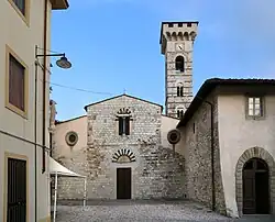 The campanile, which stands 40 metres high, was erected in 1258. The interior includes an altarpiece depicting an Enthroned Madonna and Child with a young St John the Baptist, St Andrew Apostle, and St Lawrence (1586) and a Crucifixion (circa 1580) by Giovanni Maria Butteri.[1][2]