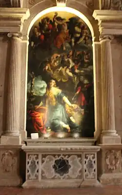 Continuing on, one encounters the Da Prato altar, characterized by a neoclassical-style frame that encloses a Baroque altarpiece, The Ecstasy of St. Mary, commissioned by Giacomo Dal Prato and signed and dated by Alessandro Turchi,[note 7] in which one can see the contrast of a bright paradise populated by angels with the gloomy representation of the earthly world where Magdalene is found.[15][16] On either side of the tympanum are two statues, made between the 19th and 20th centuries, representing angels, while above is the wooden sculpture of Magdalene, once on the Dolcetti altar.[17] At the foot of the altar are the tombs of the patrons: Girolamo da Prato and his brothers Giacomo and Bonifacio.[18]