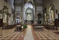 For a long time it was believed that between 1545 and 1550 the Veronese architect Michele Sanmicheli had been entrusted with some plans for the architectural rearrangement of the church, which nevertheless remained on paper, including the division into three naves and the construction of a wide transept. More recent studies, however, have disproved this hypothesis, confirming that the architect was indeed interested in the church, but only spiritually, as this was where his family tomb was located and where he also wished to be buried.[2]