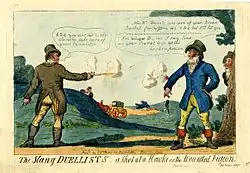 Sancho's five-year-old season was adversely affected by injury: he made only two appearances and failed to win. Having missed the early part of the season he was scheduled to compete in a series of four matches at Lewes and Brighton in the summer. In the first of these races, he was ridden in a four-mile, 2000 guinea match against Pavilion at Lewes on 24 July. The event attracted heavy betting and a large crowd which included the Prince of Wales and many members of the British aristocracy.[21] Before the race, Sancho looked less than fully fit and was opposed in the betting, but after tracking Pavilion in the early running, he took the lead ten furlongs from the finish and looked poised to win easily. With a quarter mile to go however, he began to show signs of lameness and then broke down completely with an injury to his left foreleg.[22] Mellish also lost an estimated £18,000 in bets on the race and it was reported that Sancho would never race again.[21] After the race the Prince of Wales, who had backed Pavilion, attempted to commiserate with Mellish, saying that that was sorry for him: "No you're not, your Royal Highness," Mellish retorted, "for you've won your money".[23] Sancho was unable to run in the remaining summer matches, leaving Mellish to pay forfeits of totaling 1,600 guineas.[24]