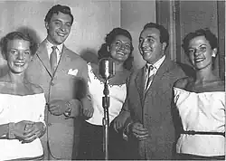 Group photo of some of the competing singers, Duo Fasano (left and right sides), Achille Togliani, Nilla Pizzi and Gino Latilla