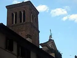 The square Romanesque campanile is situated on the back of the church at its left side. Construction was started in 1196 under the pontificate of Pope Celestine III. The top part can be dated back to the end of the 12th century, while the base is somewhat older and can be dated at ca. 1090.