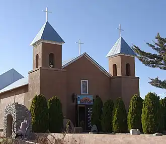 The existing Santa Cruz Catholic Church building in the Holy Cross Parish was originally constructed between 1733 and 1748 to replace a structure that was reported to be in danger of collapsing and beyond repair,[4] although the Archdiocese of Santa Fe archives do not have a record either that Santa Cruz was a parish or that there was a church building existing at that time.[5] The first baptism in the community was recorded on September 15, 1710. Artwork in the church has been contributed by well known local Santeros. The church is currently maintained by the Sons of the Holy Family and is open to tourists and visitors Monday through Friday.[6]
