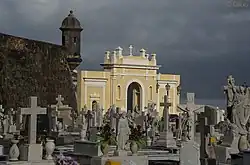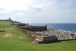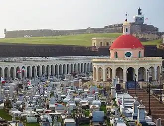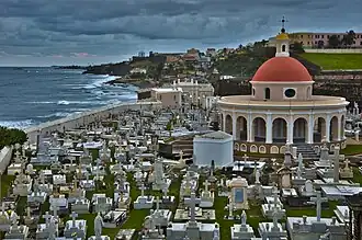The Santa María Magdalena de Pazzis Cemetery (Spanish: Cementerio Santa María Magdalena de Pazzis) is a colonial-era Catholic cemetery located in Old San Juan, Puerto Rico. It is the final resting place of many of Puerto Rico's most prominent natives and residents. Construction began in 1863 under the auspices of Ignacio Mascaro. The cemetery is located outside the walls of Castillo San Felipe del Morro fortress, one of the island's most famous landmarks. The average height of the wall is 12 metres (39 ft) and the width ranges from 4.6 to 6.1 metres (15 to 20 ft).[1] It was named in honor of Saint Maria Magdalena de Pazzi.