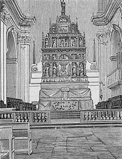 The church has a wooden episcopal throne, putatively used by Emperor Charles V on his visit of the city, and thus now decorated with a Hapsburg double headed eagle. In the church are some wooden icons attriputed to Giambattista Li Volsi; a marble Madonna attributed to Francesco Laurana; and an altarpiece depicting the Martyrdom of St Lawrence by Giacomo Campione.[1]