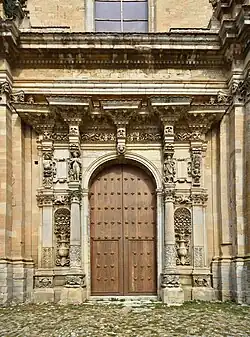 The facade is preceded by a scenic staircase leading to the highly sculpted central portal. This portal was donated by a local noble, the Baron of Sant'Agrippina. Atypical for churches, it contains pagan imagery atop the pilasters, depicting from right to left: 1) Bacchus, god of wine; 2) Venus, goddess of love with Cupid; 3) goddess Ceres with a palm leaf in her hand, and 4) Aeolus, the god of winds. The flanking smaller portals include the one intended for the Congregation of the Monte di Pietà and on the right, the door used only in the Jubilee.