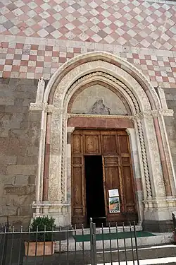 The slightly pointed arched entry portal captures the attention with its intricate decorative program of relief structure. The inner pilaster is a Solomonic column. Along a frieze are medallions displaying the corporal and spiritual works of mercy (opere di misericordia) or sacraments. These are intertwined by a looping sculpted vine with grape clusters. At the top of the frieze, noblemen or rulers in their chairs or thrones pay homage to the Virgin and Jesus, who stand before an unveiled curtain.[1]