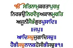 | The Sikh Maha Mantar in larivaar (joined) Gurmukhi[a] | ੴਸਤਿਨਾਮੁਕਰਤਾਪੁਰਖੁਨਿਰਭਉਨਿਰਵੈਰੁਅਕਾਲਮੂਰਤਿਅਜੂਨੀਸੈਭੰਗੁਰਪ੍ਰਸਾਦਿ॥ |