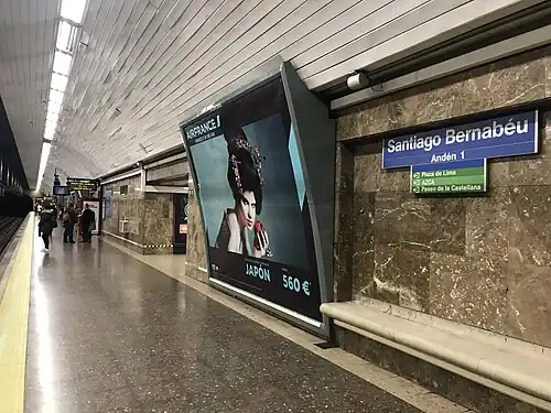 Santiago Bernabéu [sanˈtjaɣo βeɾnaˈβew] is a metro station on Line 10 of the Madrid Metro. It is located in fare Zone A.[1] It is located next to the Real Madrid's Santiago Bernabéu Stadium.