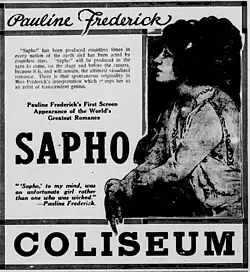 Sapho is a 1917 American silent drama film directed by Hugh Ford and written by Hugh Ford and Doty Hobart. The film stars Pauline Frederick, Frank Losee, John St. Polis, Pedro de Cordoba, and Thomas Meighan. It is based on the novel Sappho by Alphonse Daudet.[1][2] The film was released on March 11, 1917, by Paramount Pictures. It is not known whether the film currently survives.[1]
