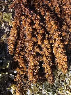Sargassum polyphyllum, or limu kala, consists of thin, rough, wavy blades and a firm thallus.[2] Its height can range anywhere from 4 to 70 centimeters.[3] Sargassum polyphyllum is versatile and resilient enough to survive in areas such as harsh intertidal zones.[3]